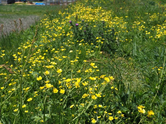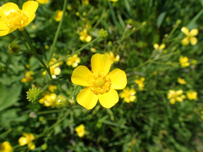 ため池の堤防にウマノアシガタが群生。花びらがキラキラと光るのでデジカメでは色飛びしやすい。花びらの中の細胞層が太陽光を反射しているためでキンポウゲ属の特徴。hmatsui