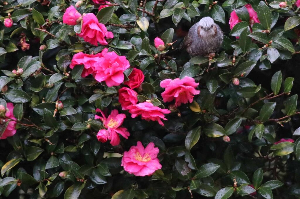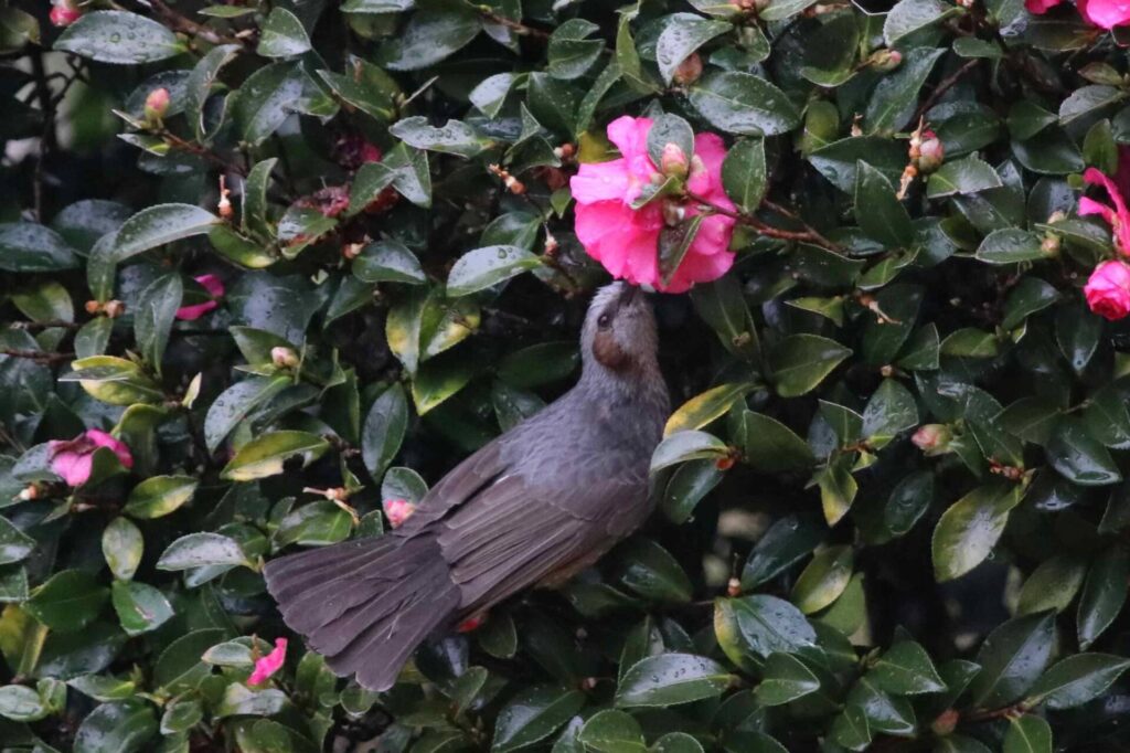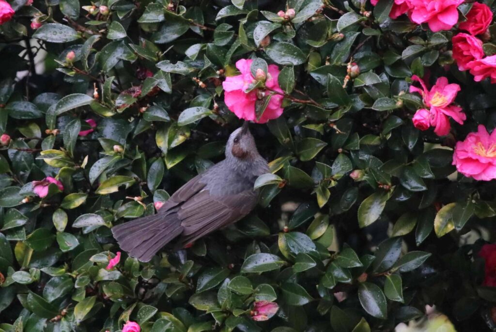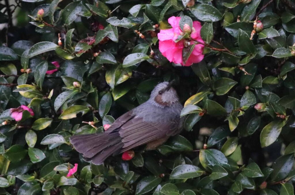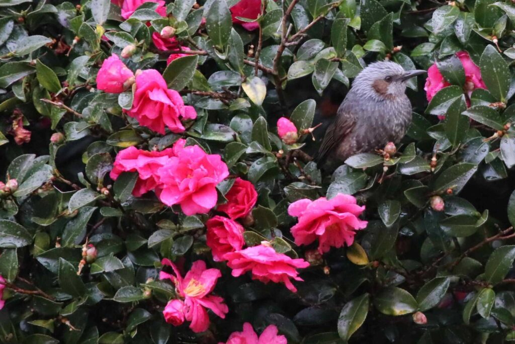 雨上がり。カンツバキの花にヒヨドリが来ていました。