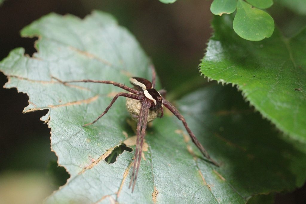 ミヤマフユイチゴの葉に卵のうをかかえたクモがいました。