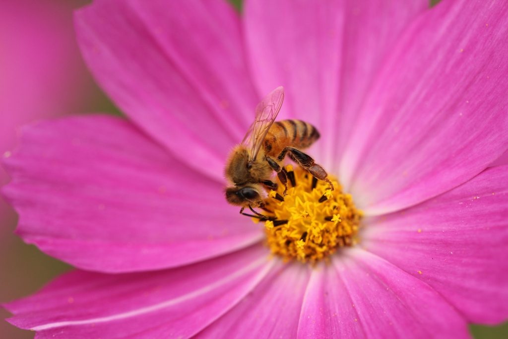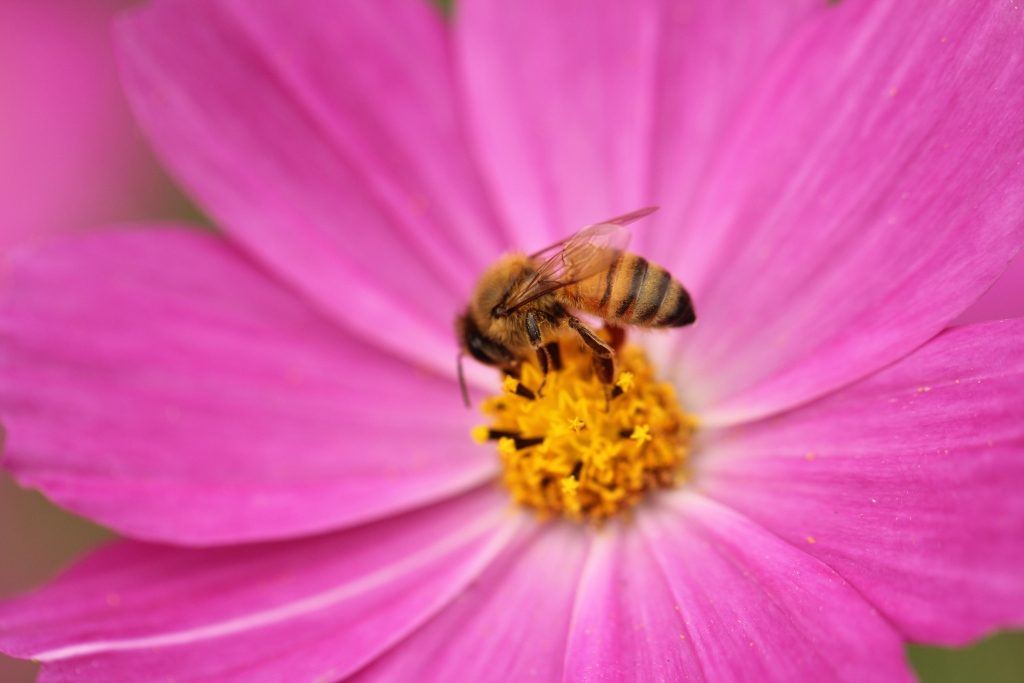 コスモスに吸蜜と花粉集めにミツバチが来ていた。セイヨウミツバチのようだった。