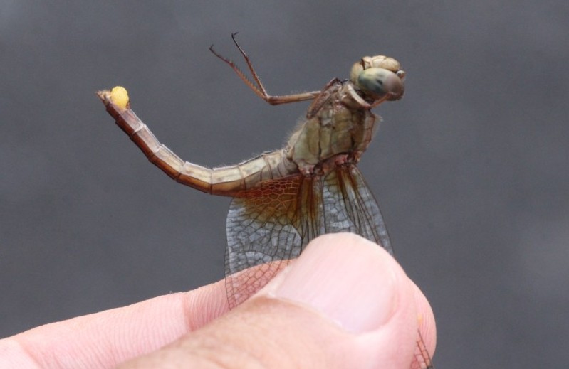 ショウジョウトンボがいました。メスを捕まえると、卵を出していました。