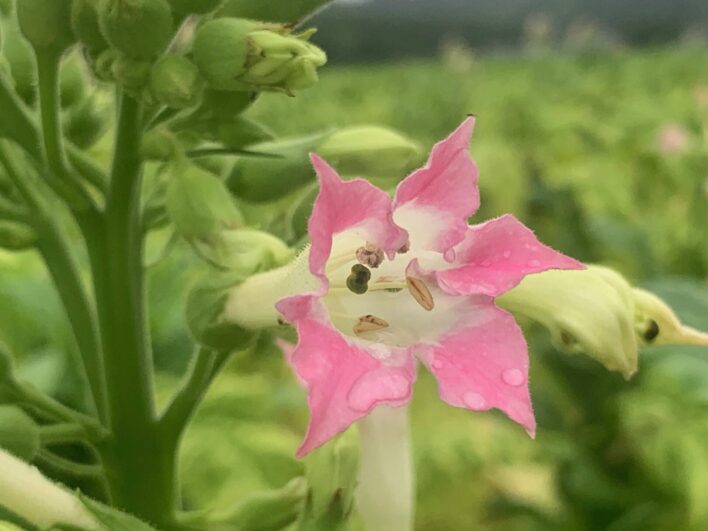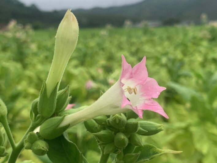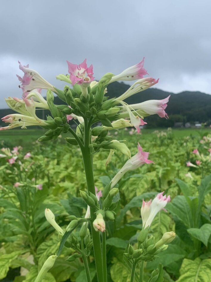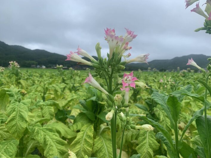 タバコを栽培している水田。梅雨空に花が咲いていました。