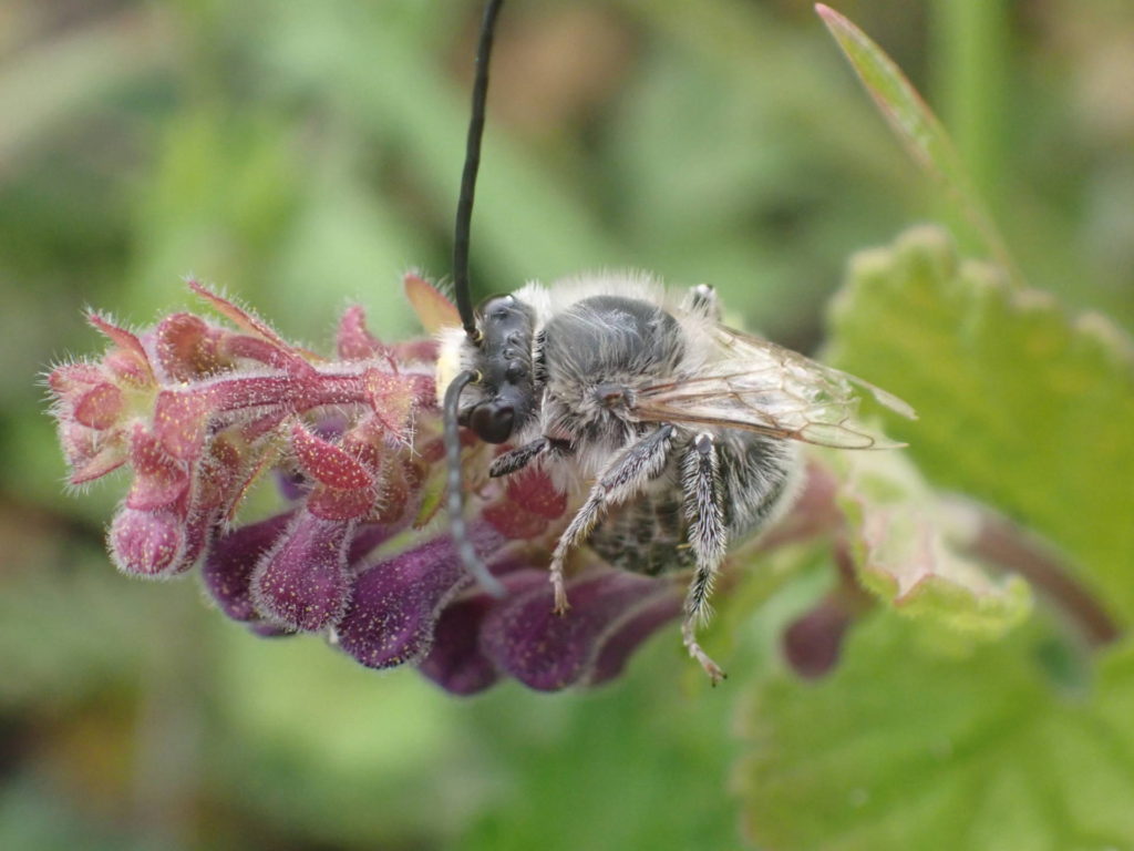 羽がボロボロのハチがタツナミソウにしがみついていました。