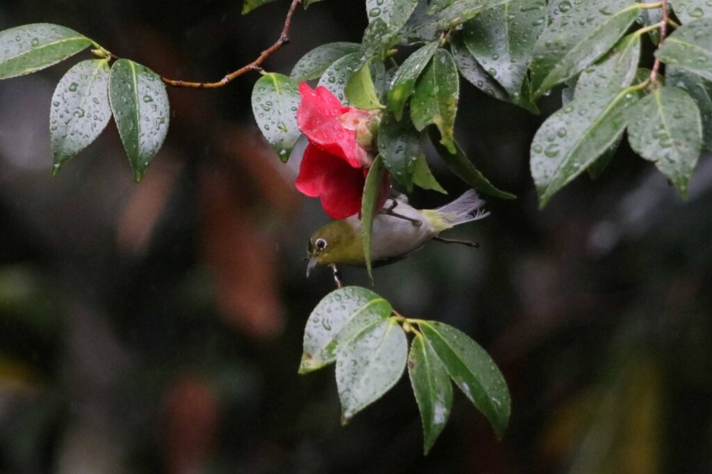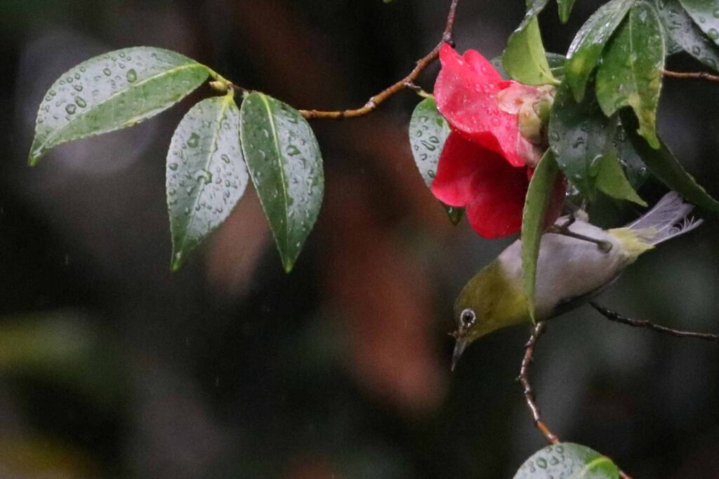 メジロがヤブツバキの花で吸蜜。雨でしたが、がんばってました。