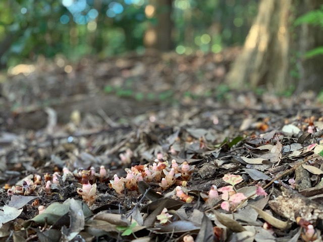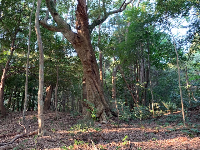 ヤッコソウの自生地です。スダジイの大木の根元周辺にたくさんヤッコソウが出ていました。
